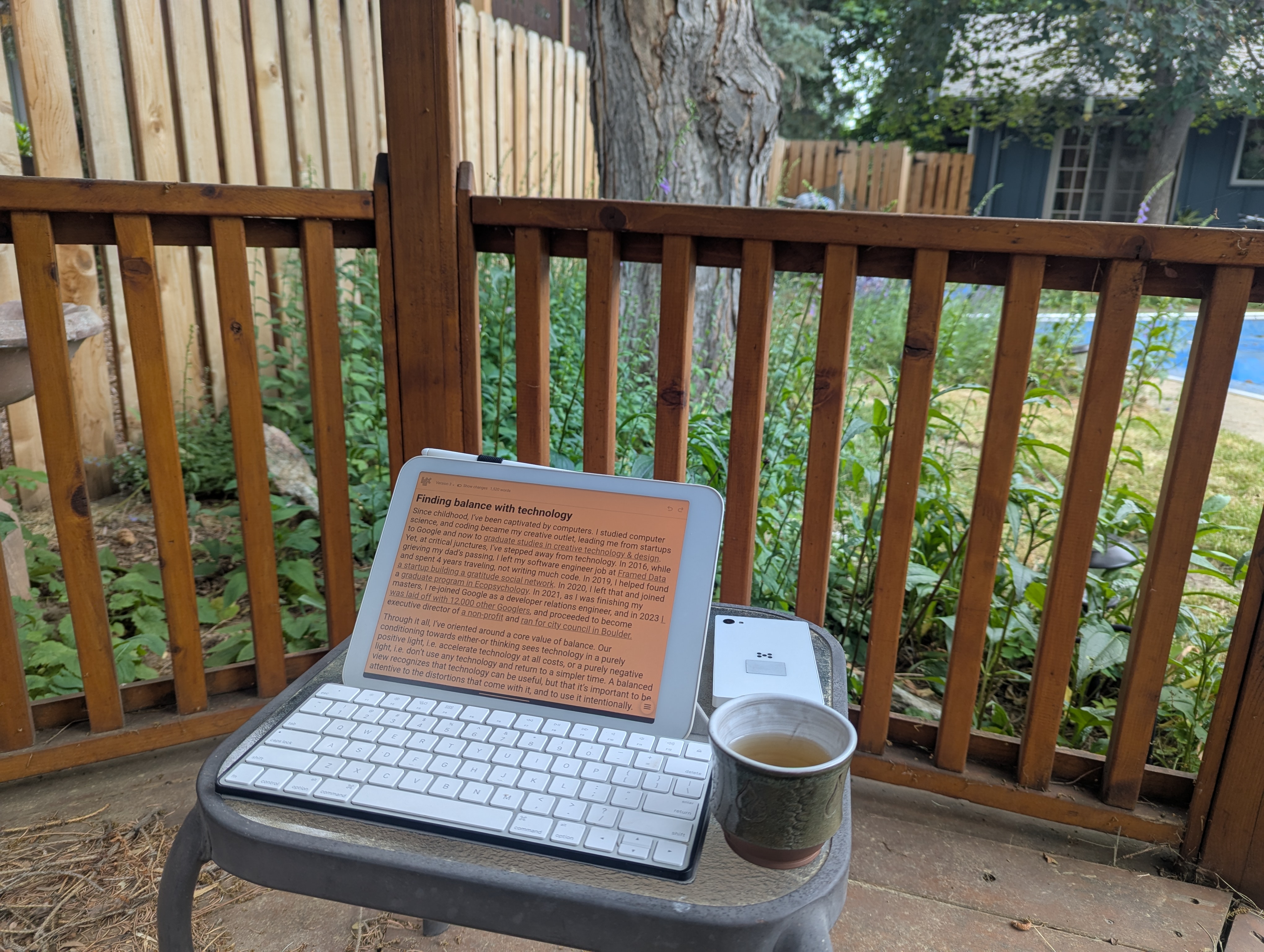 The Daylight Computer has been a real game changer, and this company could become one of the most revolutionary new hardware companies of this decade. It uses a different technology than e-ink, called e-paper or reflective LCD. It feels like paper on the eyes and is visible in direct sunlight, but it’s also 60 fps and feels smooth, unlike traditional e-ink devices. The smoothness and adaptability of this device have made it a go-to for creativity and consumption. I check email, read e-books and articles, send messages, and write on it. I’m using it now (with a Magic Keyboard/Fintie keyboard case). Given how generative AI is increasing the importance of articulation in creativity, this makes the device I write on more important than ever. Now my creativity can happen in my office, at my tea table, a park, or halfway up a mountain.